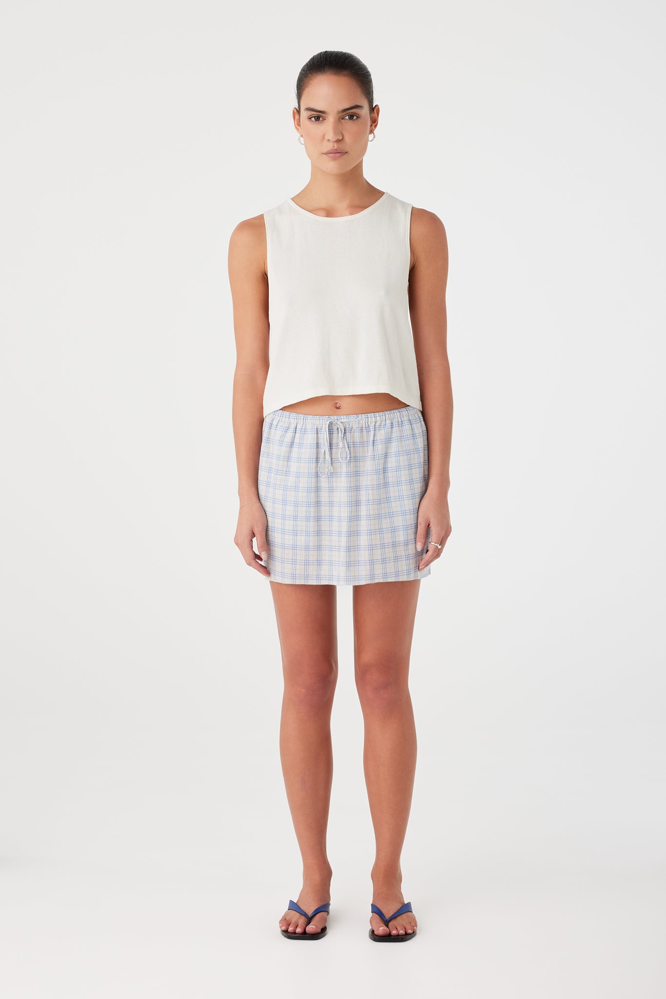 A relaxed mini skirt in a soft, lightweight cotton check. Features a gathered elastic waist with an adjustable tie for ease and comfort through warmer days.