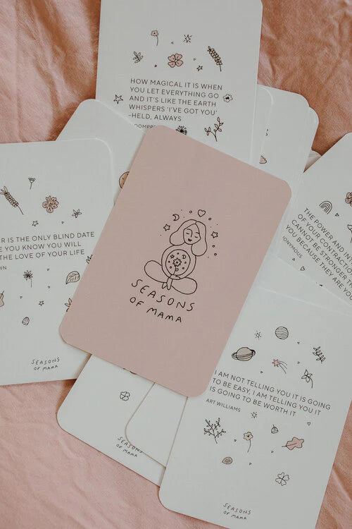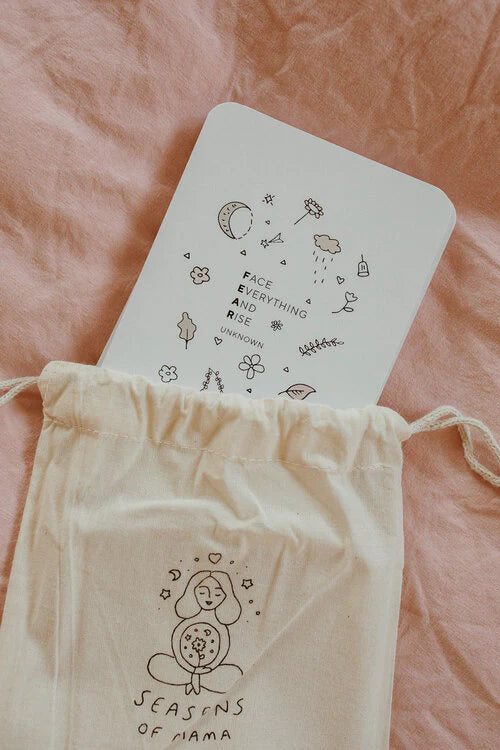 The set includes 31 cards, each with their own hand-drawn illustrations, packaged in a Seasons of Mama branded calico bag! They also now include two blank affirmation cards for you to include your own affirmation/mantra or perhaps an older sibling would like to create one for you in the form of words or pictures.