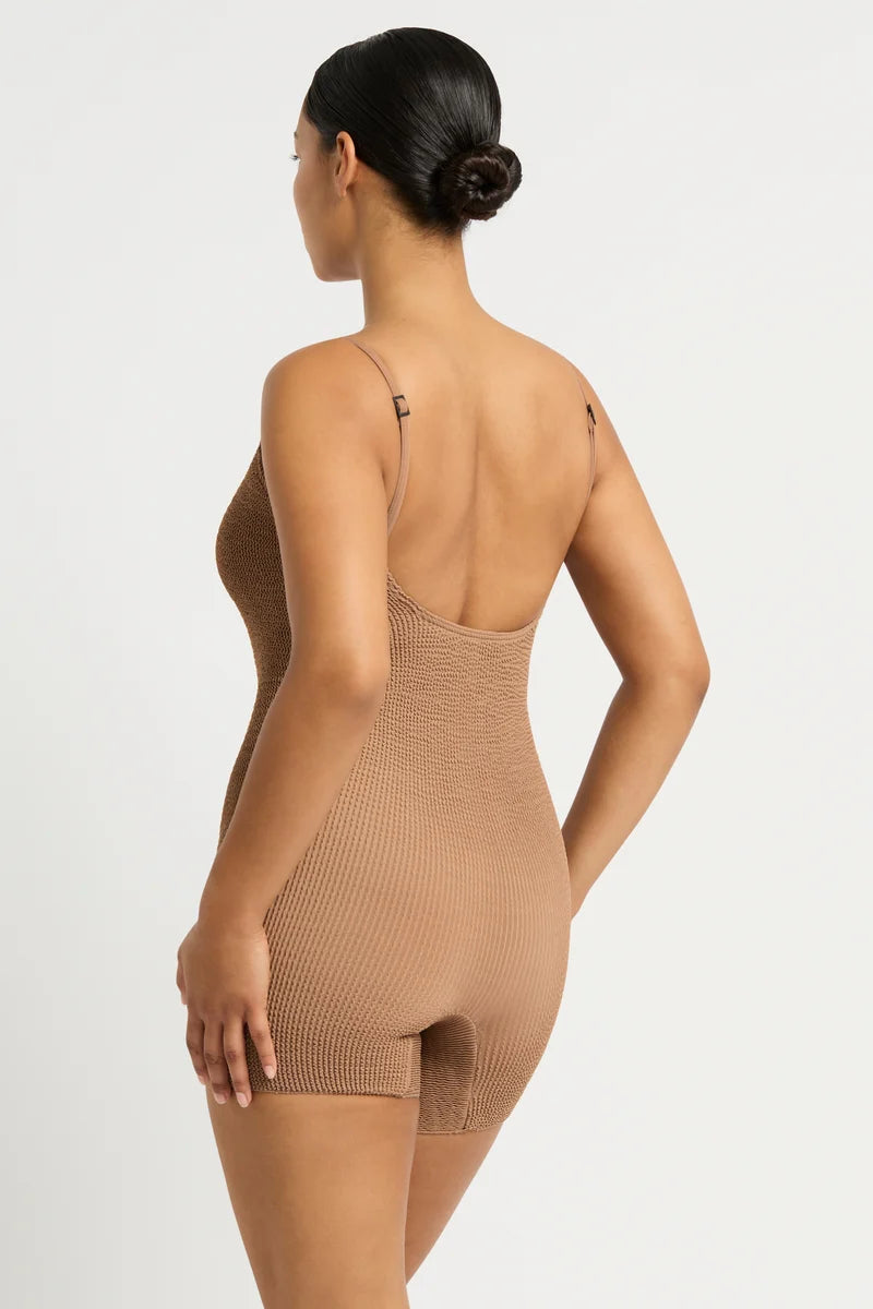 Meet the Rene Playsuit – your go-to for chic comfort. With a flattering V-neckline, adjustable bind straps, and a distinctive scoop back, it's not just loungewear – it's a style statement. Crafted from The Authentic Crinkle™, this versatile piece effortlessly transitions from casual to chic with a simple tee pairing.