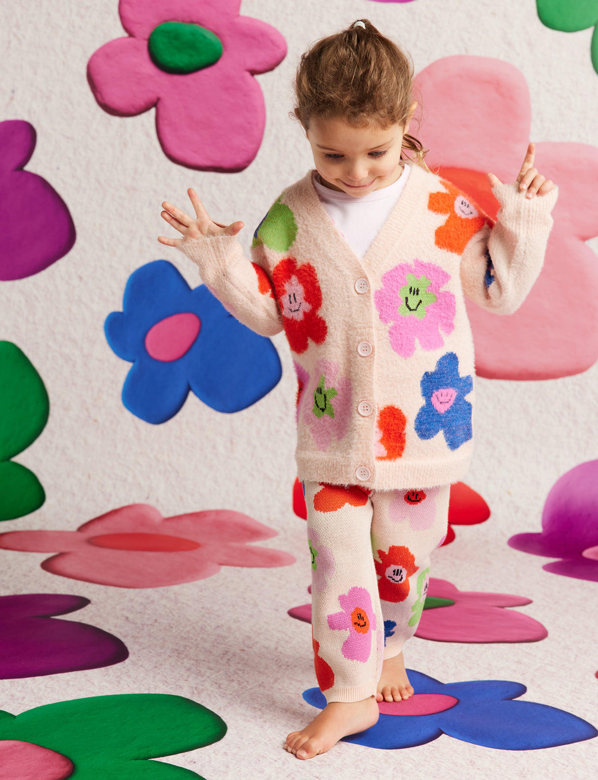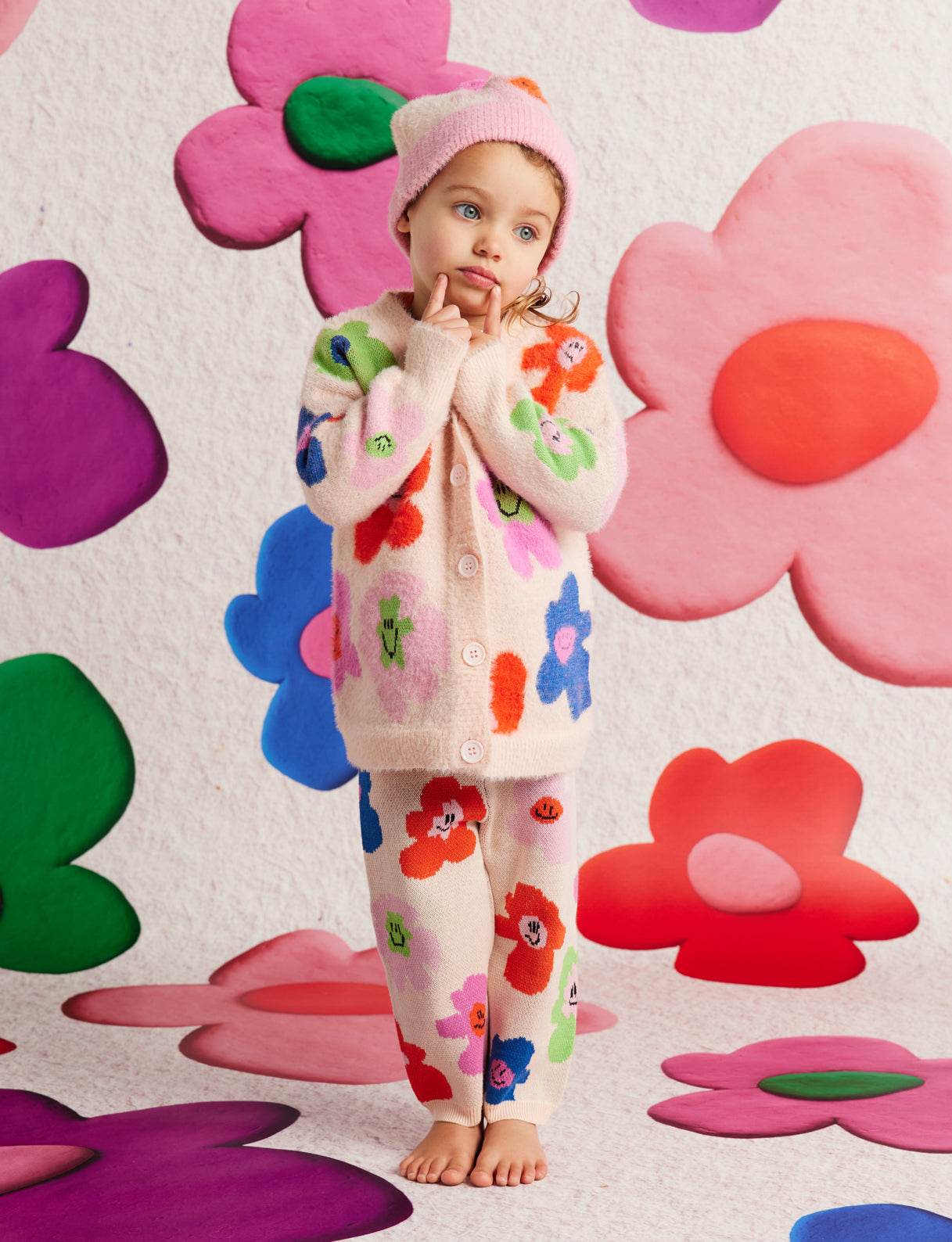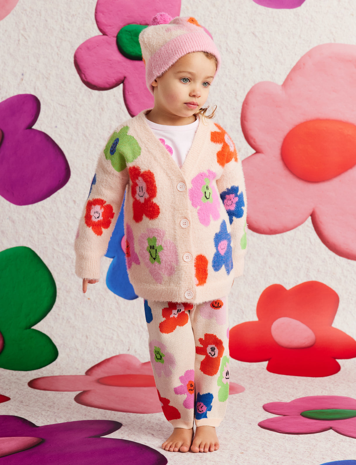 Features a central button opening, subtle fluffy finish and picture knit design from our Hej Blomma! collection on both sides.