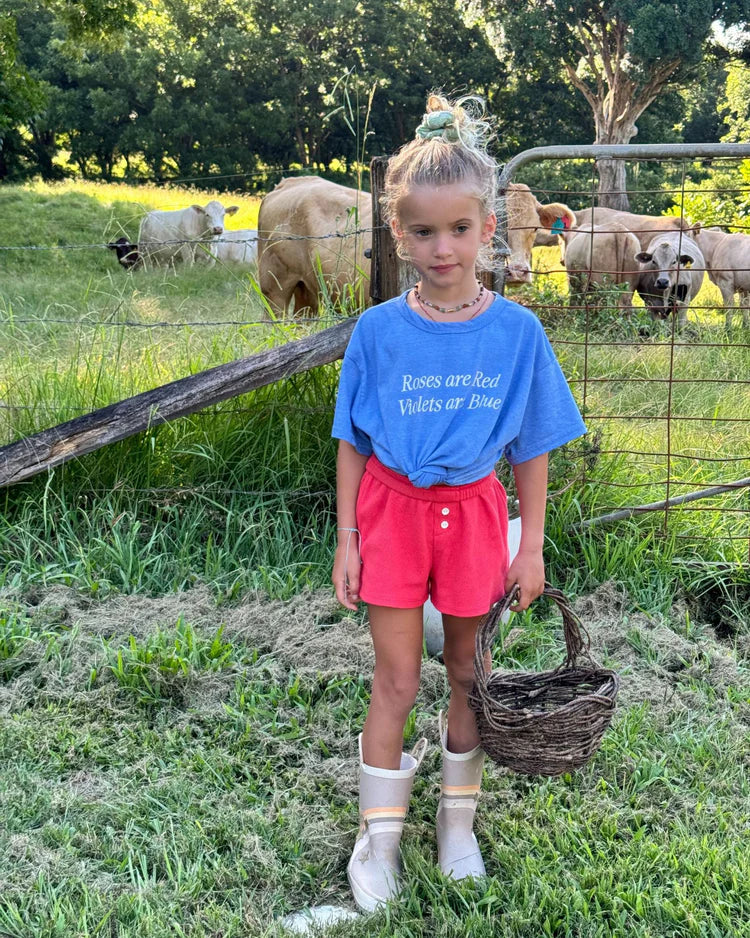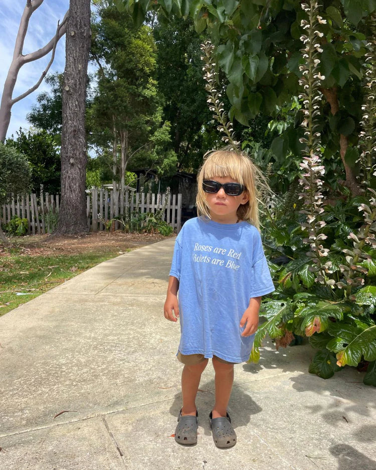 a premium, lightweight washed cotton tee with a relaxed fitting boxy cut and self fabric neckline. roses are red, violets are blue graphic printed across the front in milk