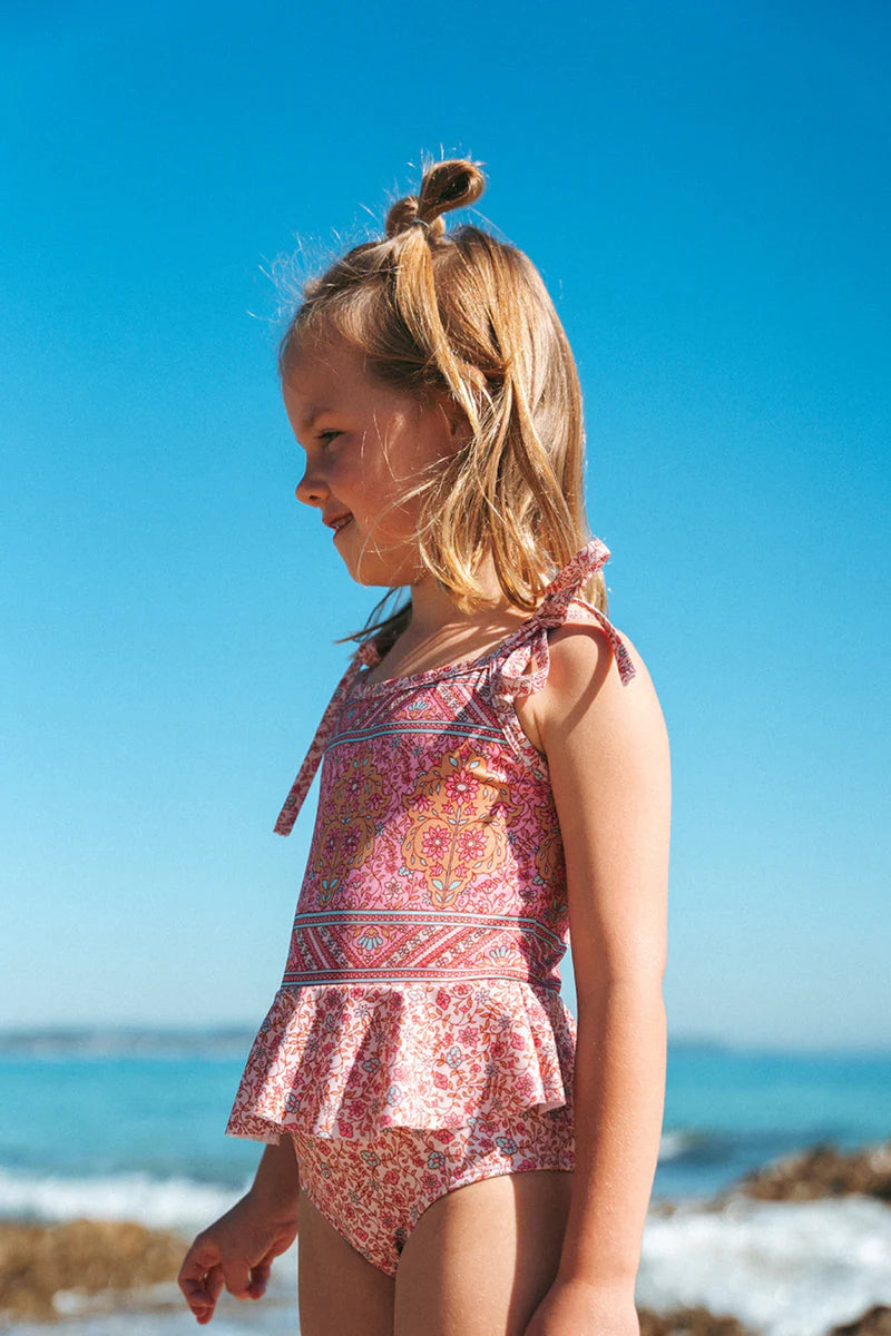 Our girls one piece swimsuit is made for little beach lovers. Featuring bow tie straps and playful frill details on the waist, this full piece combines comfort with coastal charm. Crafted from eco-friendly recycled fabric with UPF 50+ protection, it’s perfect for pool parties, sandy adventures, and long summer days by the water.