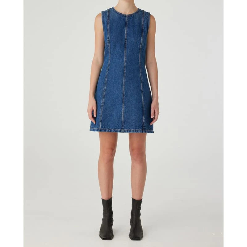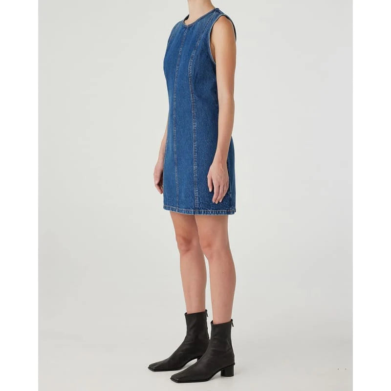 Nobody Denim's vintage inspired denim dress. The Lucy Dress is sleeveless, slim through the body and finishes at the upper thigh. Featuring vertical seaming and back zip opening. Crafted from premium rigid denim.
