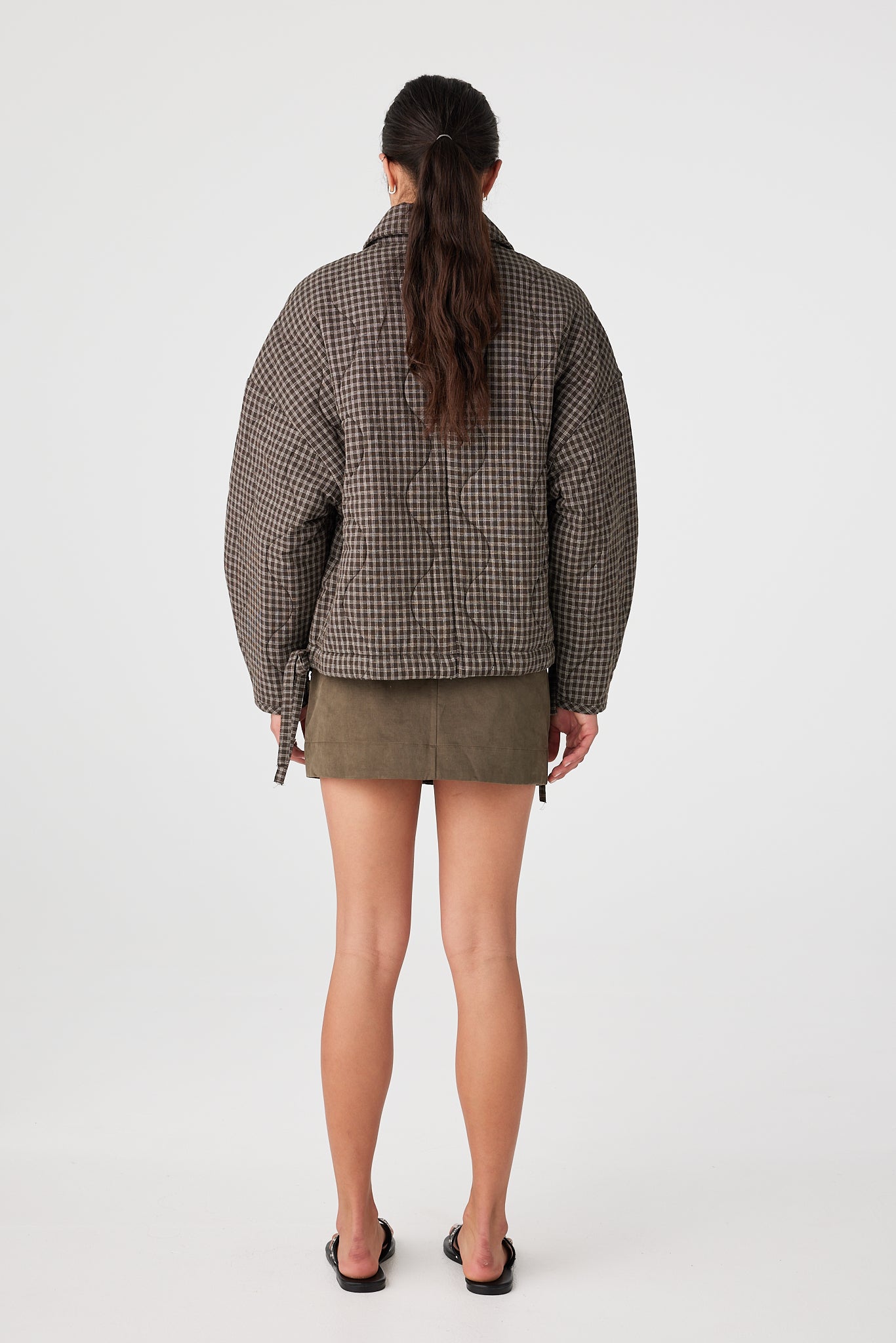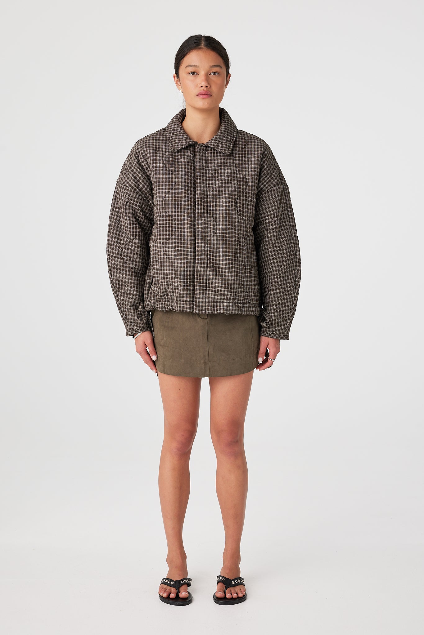 A quilted cotton jacket with a slouchy, cocoon shape, dropped shoulders and rounded sleeves give room for layers and movement. Concealed button front keeps the surface clean, with side pockets and a drawstring hem to pull in warmth or loosen for airflow.