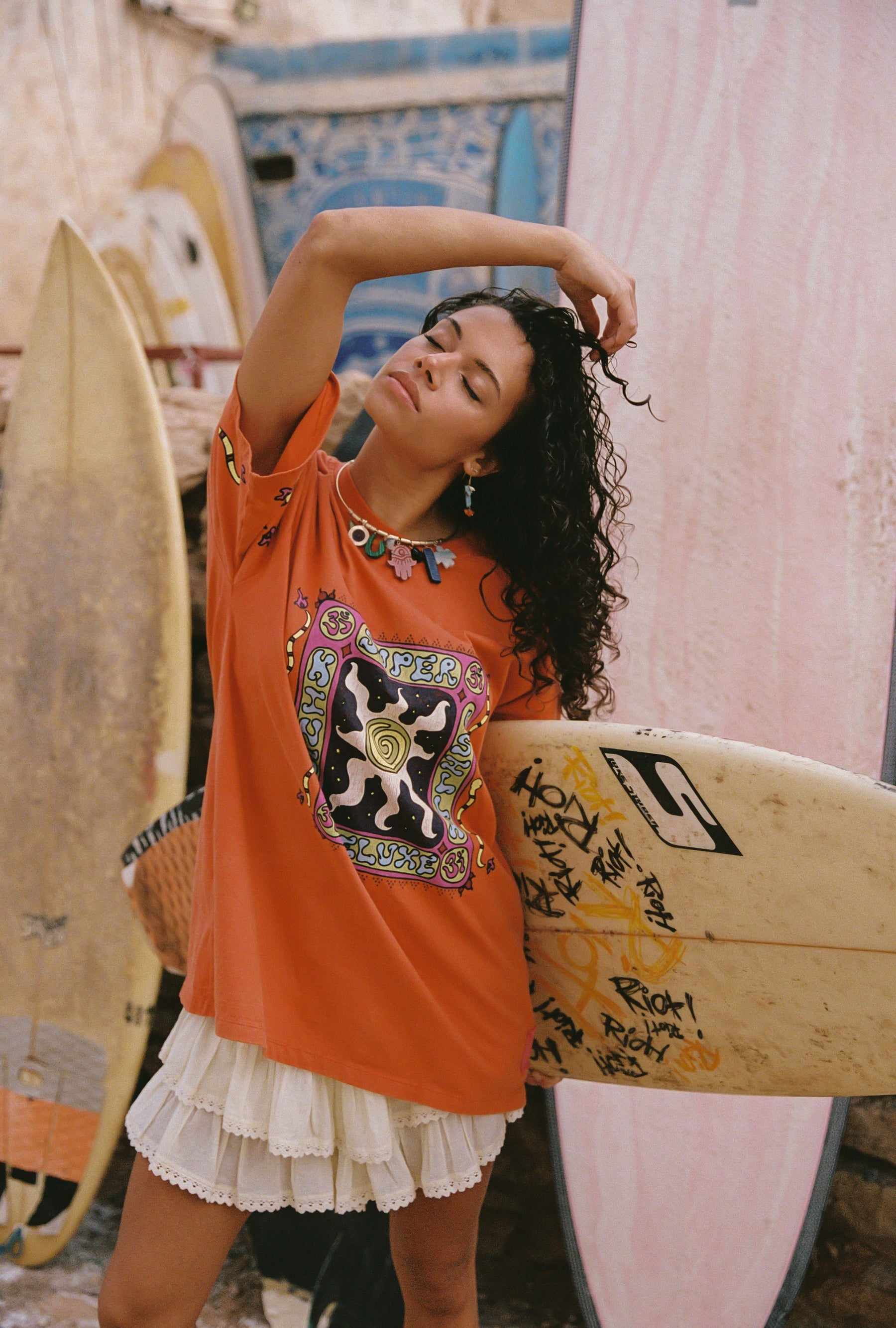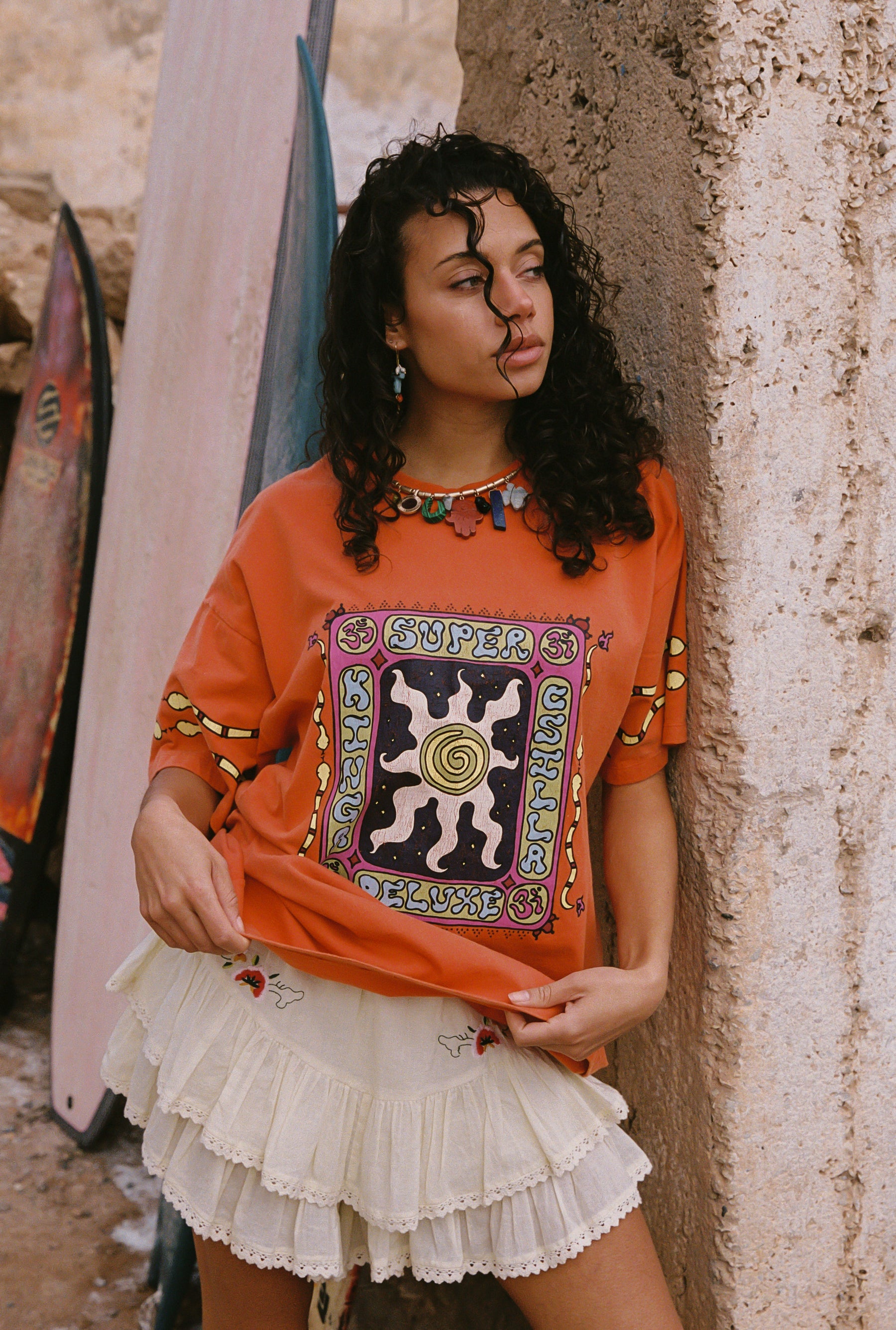 The creamy base tone makes the artwork pop while staying easy to style with denim, skirts, or thrown over swim.
