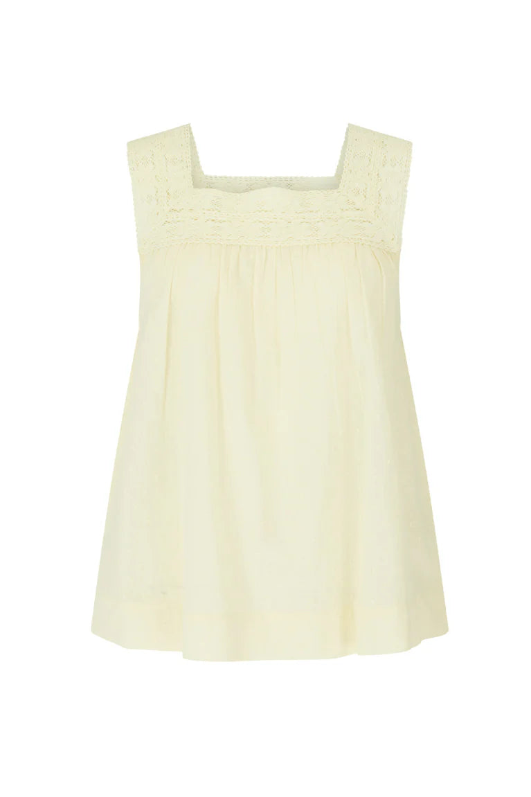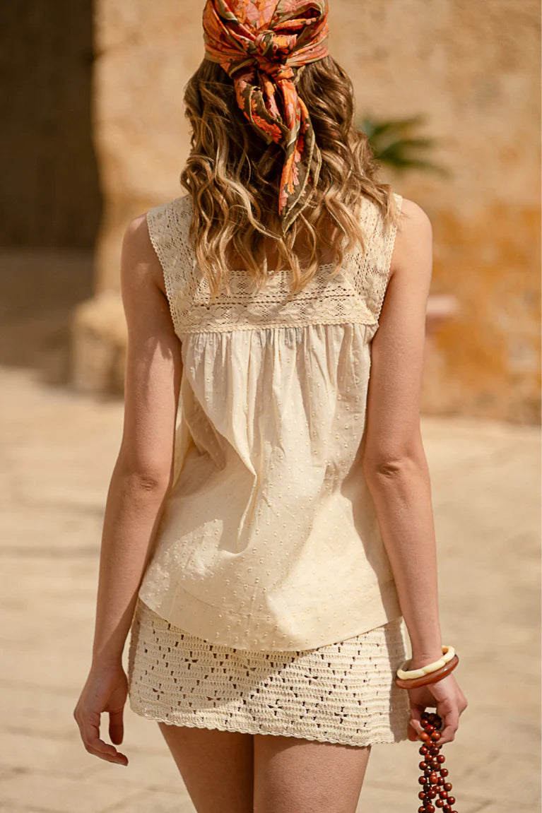 The Camille Cami feels like a soft sigh of summer — all airy innocence and sun-washed charm. Crafted in a delicate cream, it floats effortlessly over the body with textured dobby cotton that catch the light like dust motes in a sunbeam. The neckline is framed with vintage-inspired lace, adding a gentle touch of romance, as though it’s been plucked from a forgotten Mediterranean market stall where time moves slower.