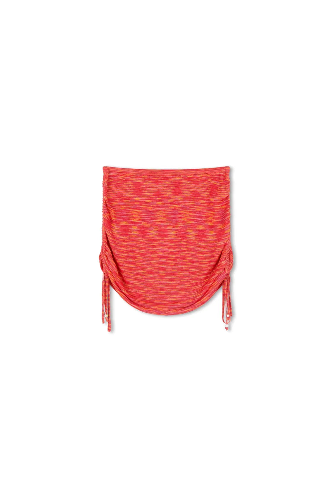 The Emi Ruched Mini Skirt in Coral is a playful spacedye knit cut from 100% recycled rayon viscose. Designed with adjustable gathered ties at the sides, it allows for custom ruching and versatile styling. Lightweight and breathable, it’s designed for warm-weather ease and elevated resort wear.