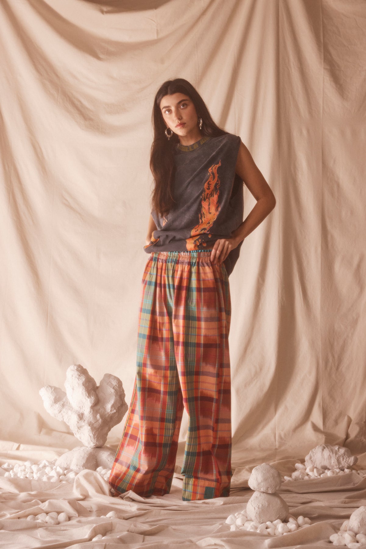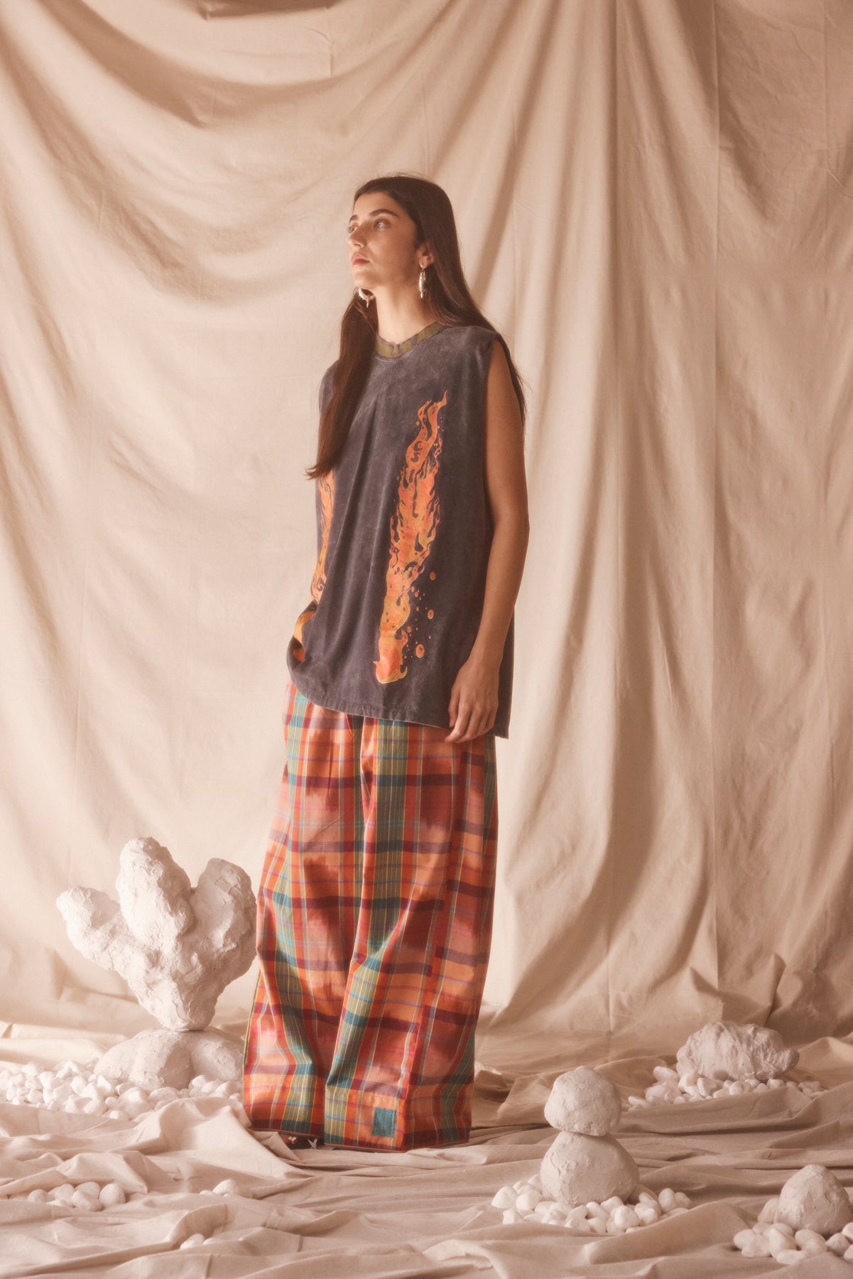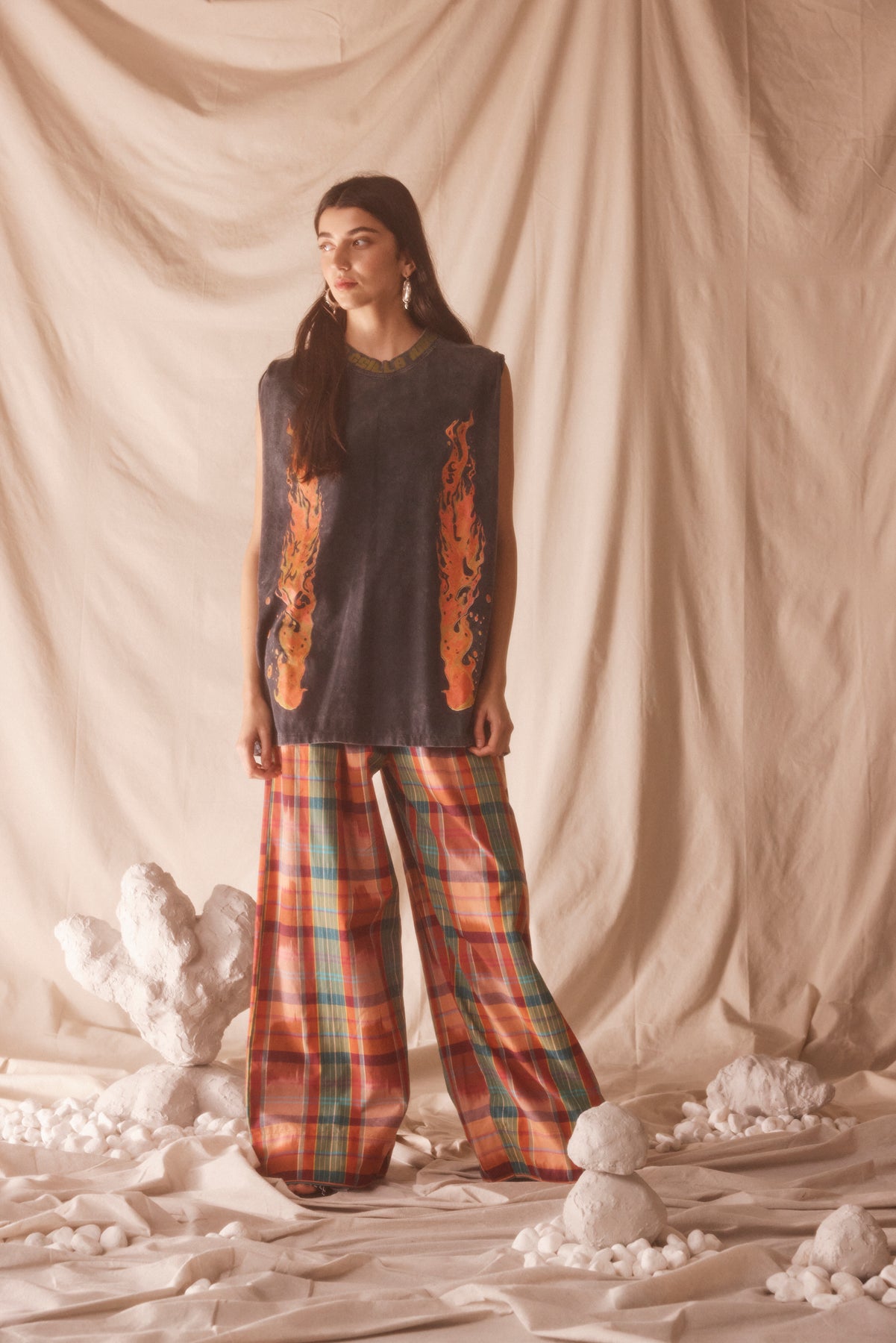 The Flaming Band Tank in washed charcoal is a sleeveless over-sized tank set to make a statement. The box-fit shirt features orange and yellow flame graphics which dance along the sides creating dynamic movement. With contrast chartreuse trim at the neckline and a soft stone-washed finish, this handcrafted piece embodies effortless resort style and everyday luxury. Perfect for sun-soaked days and balmy evenings alike.