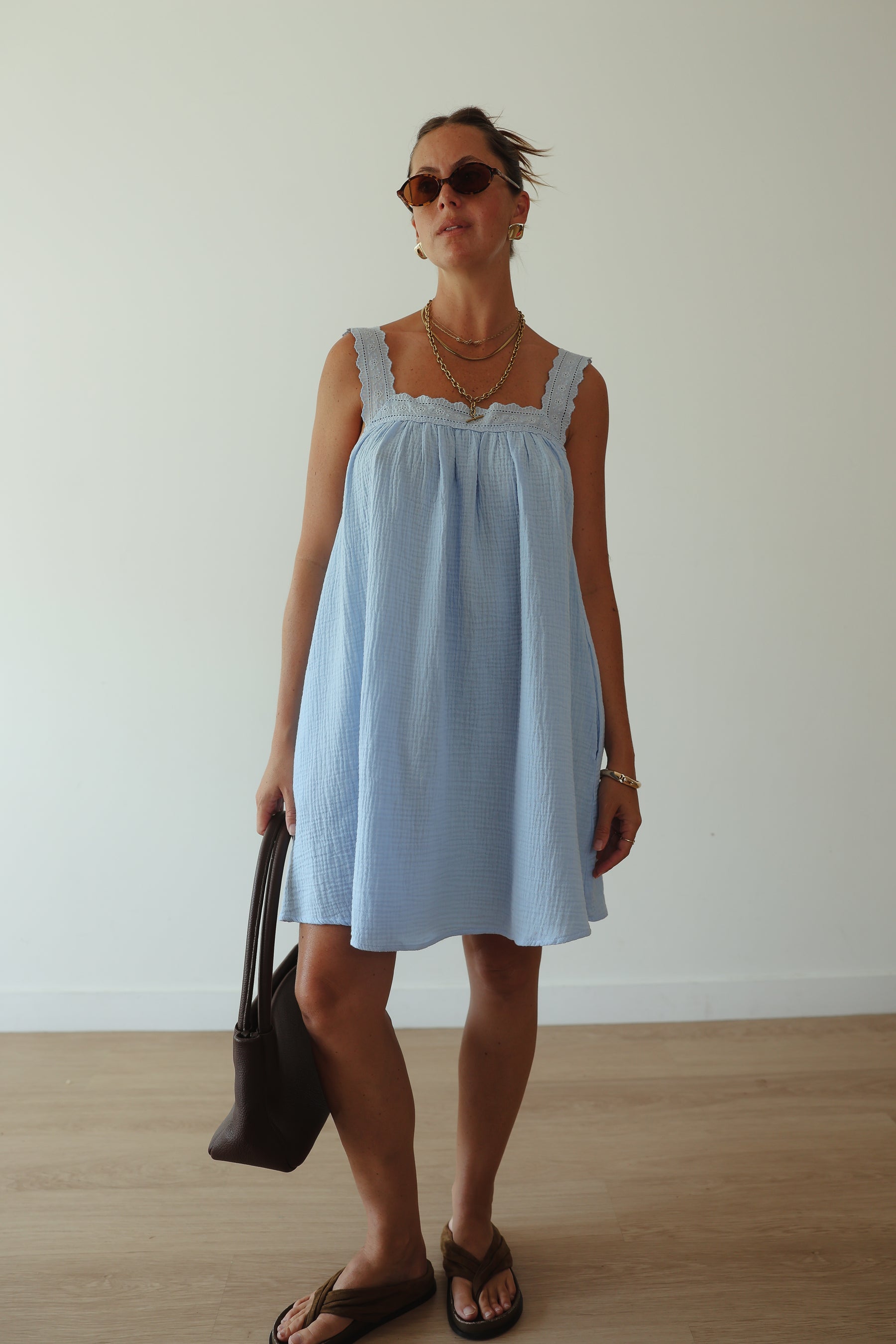 Fall in love with the Juno Slip — a dreamy remake of a 1970s classic. Crafted from the softest double-gauze cotton in a beautiful baby blue, this piece floats effortlessly with every step. Featuring a lowered square lace-trim neckline and hidden pockets, it’s soft, feminine, and made to make you feel something special.