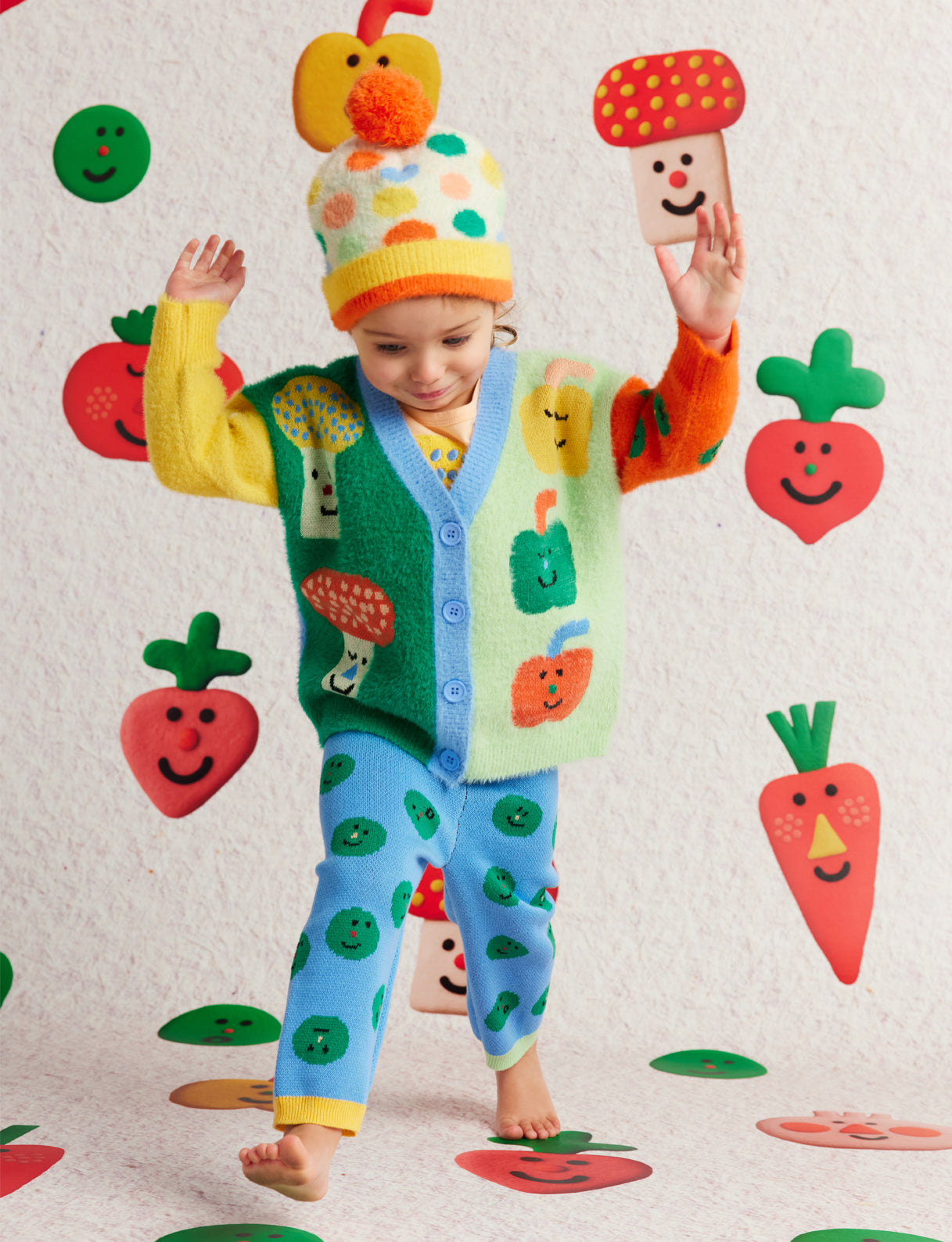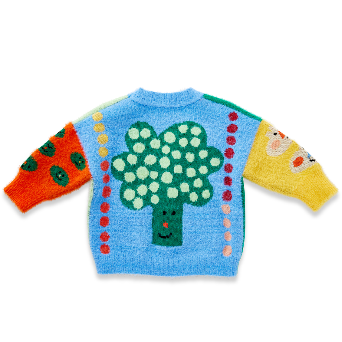 Features a central button opening, subtle fluffy finish and picture knit design from our Pocket Patch collection on both sides.