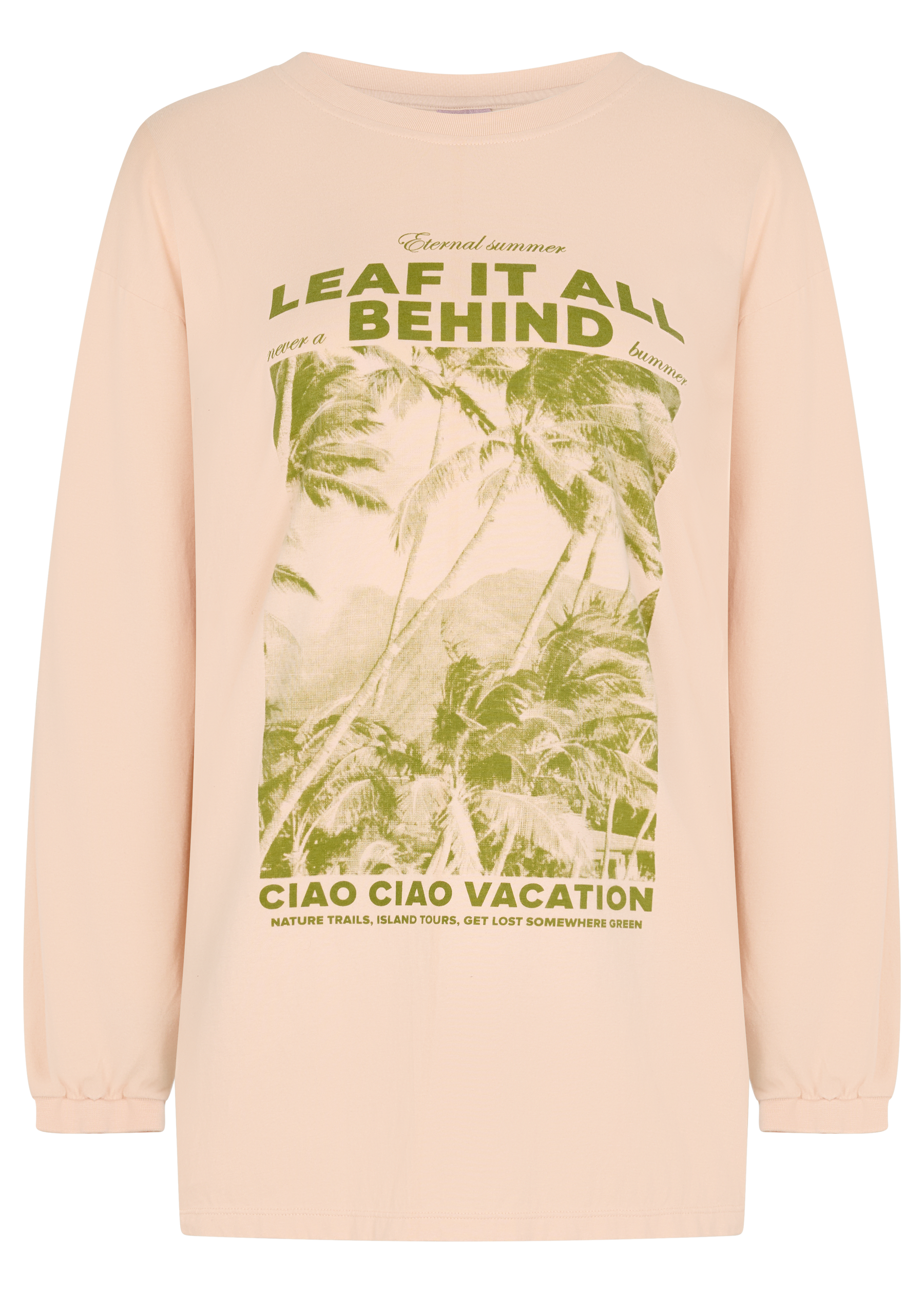 AN OVERSIZED LONG SLEEVE DESIGNED FOR EASY, LAID-BACK STYLING. FEATURING A TROPICAL GREEN PALM TREE GRAPHIC ON THE CHEST AND SLEEVE, THIS TEE IS PERFECT TO THROW OVER SWIMMERS OR TUCK INTO SHORTS FOR AN EFFORTLESS VACATION LOOK.