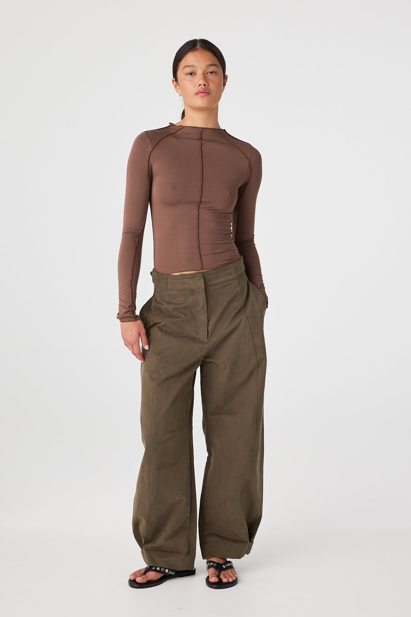 A fitted long sleeve top in fine bamboo jersey that feels smooth and cool against skin, with stretch for close-to-body comfort. Funnel neck and vertical babylock seam lines add shape and definition under oversized layers or worn on its own in mild weather.